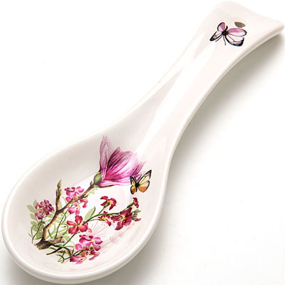 Подставка для ложки LORAINE выполнена из качественной доломитовой керамики с красочным цветочным рисунком. Пожалуй, одно из самых удобных современных приспособлений на кухне — подставка для ложки. Подложка может служить подставкой под разнообразные кухонные аксессуары. Например, так удобно при жарке продуктов на сковороде использовать ложку подставку для лопатки. Там она не загрязнит ни стол, ни другую посуду. Более того, даже обычную суповую ложку можно класть на нее. С помощью такой подставки следить за чистотой станет просто и приятно. Подставка выполнена таким образом, что ложка на ней стоит с легким наклоном, поэтому ее легко брать и ставить на место. Изделие легко и просто мыть. Подходит для мытья в посудомоечной машине.
