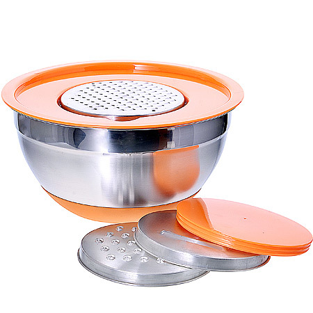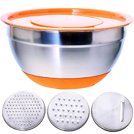 Универсальная миска с крышкой и 3 мя терками, объемом 2,5 литра, станет настоящей помощницей на кухне. Подходит для взбивания миксером и венчиком через отверстие в крышке, а также для шинковки продуктов прямо в миску. Материал миски и терок нержавеющая сталь, крышка выполнена из пластика.Терки: мелкая, крупная, шинковка. На дне миски силикон, что обеспечивает устойчивость миски на поверхности. При взбивании миксером крышка не даст брызгам разлететься во все стороны.