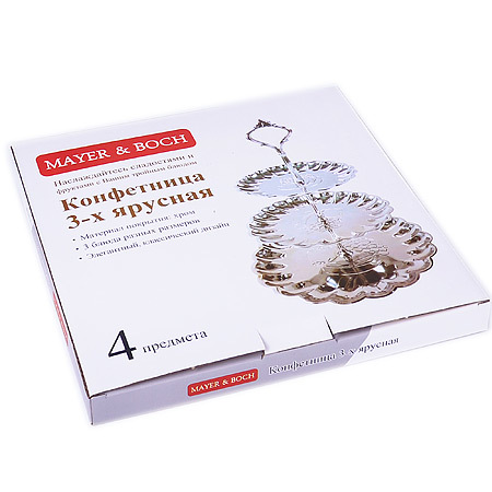 3 х ярусная конфетница MAYER BOCH выполнена из нержавеющей стали. Каждая хозяйка знает, что многоуровневая конфетница незаменимая вещь на кухне. Тому есть множество причин, но самая очевидная это то, что она экономит место, ведь когда большое застолье, не всегда все лакомства умещаются на столе, а такая многоуровневая конфетница решает эту проблему. Конфетница имеет три яруса и предназначена для подачи фруктов и различных сладостей (конфет, печенья, зефира, вафель, пряников и т.д.).