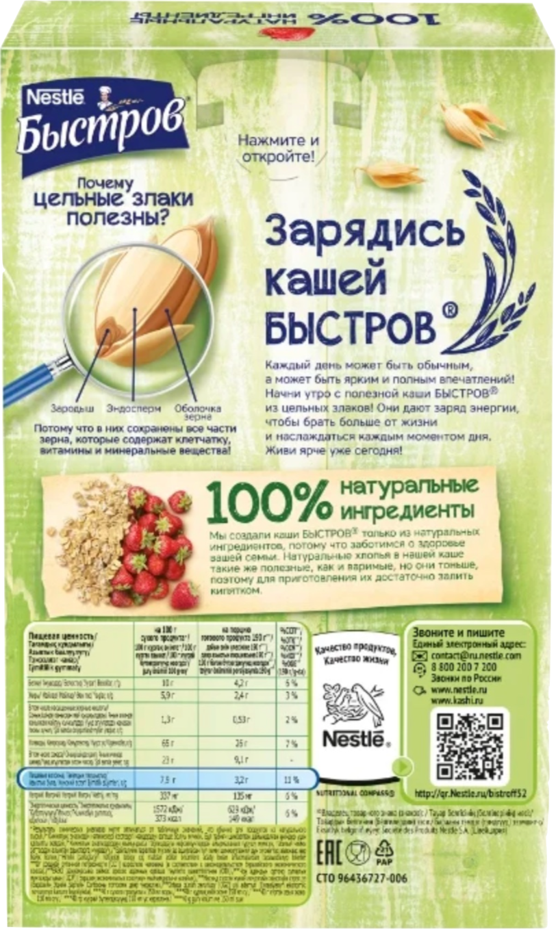 Хлопья в кашах Быстров — это высококачественные хлопья из цельных злаков. Содержит 100% натуральные цельные отборные злаки и натуральный пребиотик, улучшающий пищеварение.