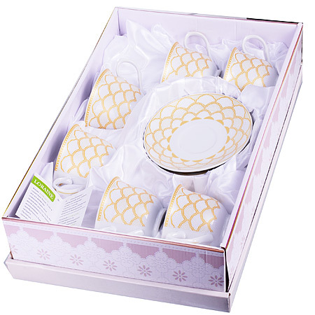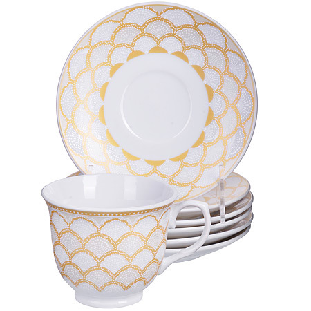 Чайный набор LORAINE на 6 персон, изготовленный из высококачественного костяного фарфора изысканного белого цвета, состоит из 6-ти чашек и 6-ти блюдец. Изделия набора украшены тонкой золотой каймой и имеют красивый и нежный дизайн. Набор придется по вкусу и ценителям классики, и тем, кто предпочитает утонченность и изысканность. Он настроит на позитивный лад и подарит хорошее настроение с самого утра. Набор упакован в подарочную упаковку. Такой чайный набор станет прекрасным украшением стола, а процесс чаепития превратится в одно удовольствие! Это замечательный выбор для подарка родным и друзьям!