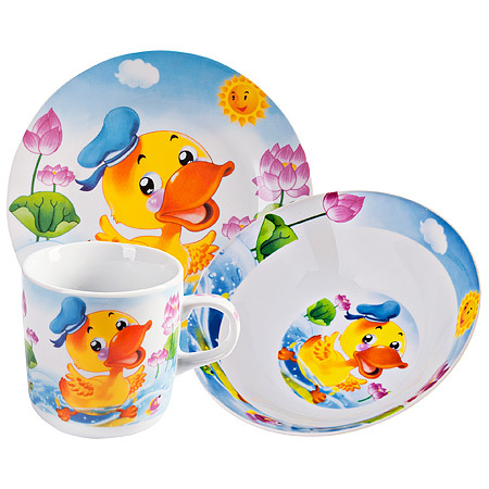 Предметы набора выполнены из высококачественного фарфора и декорированы красочным рисунком. Изделия легкие и функциональные. Такой набор обязательно понравится вашему ребенку, потому что теперь у него будет своя собственная посуда с ярким и оригинальным рисунком. Набор посуды для детей включает в себя три предмета: суповую тарелку, обеденную тарелку и кружку. Набор упакован в красочную, подарочную упаковку. Подходит для мытья в посудомоечной машине. Для детей от 4-х лет.