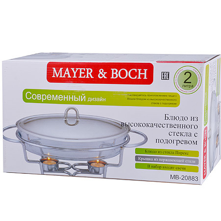 Мармит MAYER&BOCH выполнен из стекла и нержавеющей стали. Стеклянная чаша располагается на стальной подставке с двумя подсвечниками для чайных свечей, снабженной двумя ручками. Свечи, устанавливающиеся на подставке, нагревают чашу снизу, таким образом поддерживая нужную температуру приготовленного блюда. Крышка из качественной нержавеющей стали с удобной ручкой плотно прикрывает чашу сверху, в свою очередь также не давая остыть блюду. Благодаря своему элегантному дизайну, мармит с приготовленным блюдом можно сразу подавать на стол, не перекладывая еду на сервировочные тарелки. Изящный, с современным дизайном, мармит украсит любой праздничный стол, а блюда в нем будут всегда теплыми и ароматными. Стеклянная чаша (без крышки и подставки) подходит для использования в духовом шкафу и микроволновой печи. Подходит для мытья в посудомоечной машине. Подходит для хранения в холодильнике.