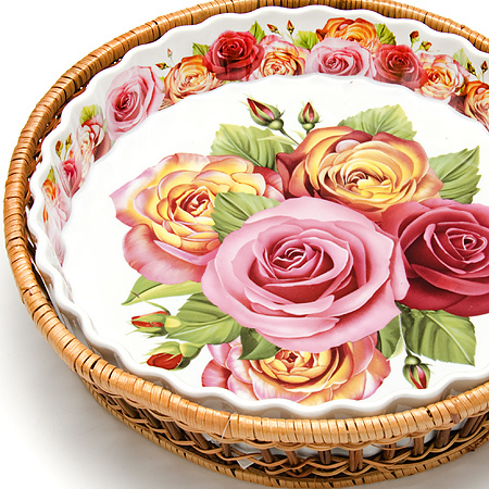 Круглая форма MAYER&BOCH выполнена из качественного фарфора белого цвета. Поверхность украшена изображением цветов. К форме прилагается плетеная корзинка из ротанга, выполняющая роль оригинальной подставки. Форма прекрасно подойдет для запекания овощей, мяса и других блюд, а благодаря своему оригинальному дизайну, она, несомненно, украсит ваш стол. Посуда не впитывает посторонние запахи, не имеет труднодоступных выступов или изгибов, которые накапливают грязь, и легко чистится. Фарфор выдерживает высокие перепады температуры, поэтому такую форму можно использовать в духовке, микроволновой печи, а также для хранения пищи в холодильнике. Подходит для мытья в посудомоечной машине. В комплекте: 1 форма, 1 плетеная корзинка.
