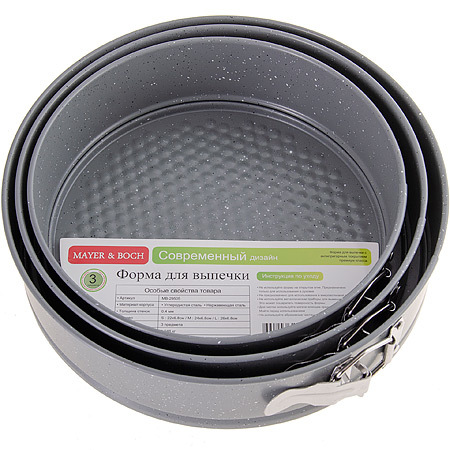 Набор форм для пирогов MAYER&BOCH изготовлен из высококачественной углеродистой стали с антипригарным покрытием. Толщина стенок изделия составляет 4 мм, что обеспечивает изделию долговечность. Форма имеет разъемный механизм и съемное дно, поэтому вынимать из нее готовую выпечку очень легко. Антипригарное покрытие формы не вступает в реакцию с продуктами питания. Выпечка в данной форме не пригорает и не прилипает к стенкам. Такая форма значительно экономит время по сравнению с аналогичными формами для выпечки. После использования легко и быстро моется. Не использовать для мытья изделия абразивные моющие средства и губки с абразивным покрытием. Подходит для использования в духовках. Не подходит для использования в СВЧ.
