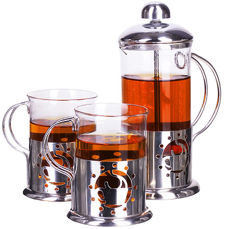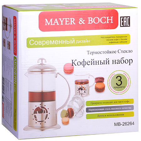 Предметы чайно-кофейного набора MAYER&BOCH изготовлены из высокотехнологичных материалов на современном оборудовании. Колба из высококачественного боросиликатного термостойкого стекла заключена в корпус из нержавеющей стали. Фильтр-поршень Френч-пресса выполнен по технологии "press-up" для обеспечения равномерной циркуляции воды в чайнике, кроме того, фильтр предохраняет от попадания в бокал чайной заварки или частичек молотого кофе. Все предметы набора оснащены удобными не нагревающимися ручками, которые также выполнены из качественной нержавеющей стали. Практичный и стильный дизайн полностью соответствует последним модным тенденциям в создании предметов бытовой техники. Френч-пресс MAYER&BOCH позволит вам быстро и без усилий приготовить свежий ароматный кофе или чай, а удобные бокалы всегда будут востребованы на вашей кухне. Подходит для мытья в посудомоечной машине. Не использовать чистящие и дезинфицирующие средства, содержащие хлор. Не подходит для использования на открытом огне.