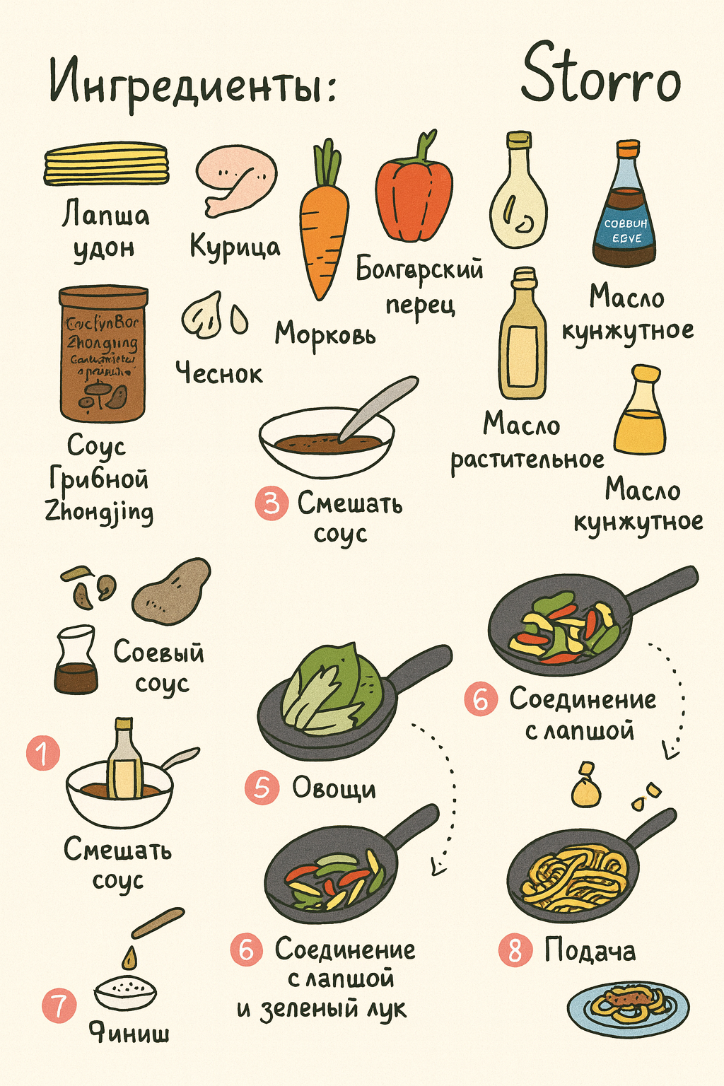 Сегодня приготовим популярную классическую японскую лапшу удон с курицей и овощами (яки-удон). Это блюдо известно своей быстрым вок-обжариванием, упругой лапшой и насыщенным соусом. Пряный грибной соус Zhongjing из шиитаке добавит дымный умами-акцент и лёгкую остроту, благодаря которой вкус получается глубоким и очень «ресторанным» 🍜🔥. Подходит и для буднего ужина, и для компанейского угощения — готовится быстро, а съедается ещё быстрее.
