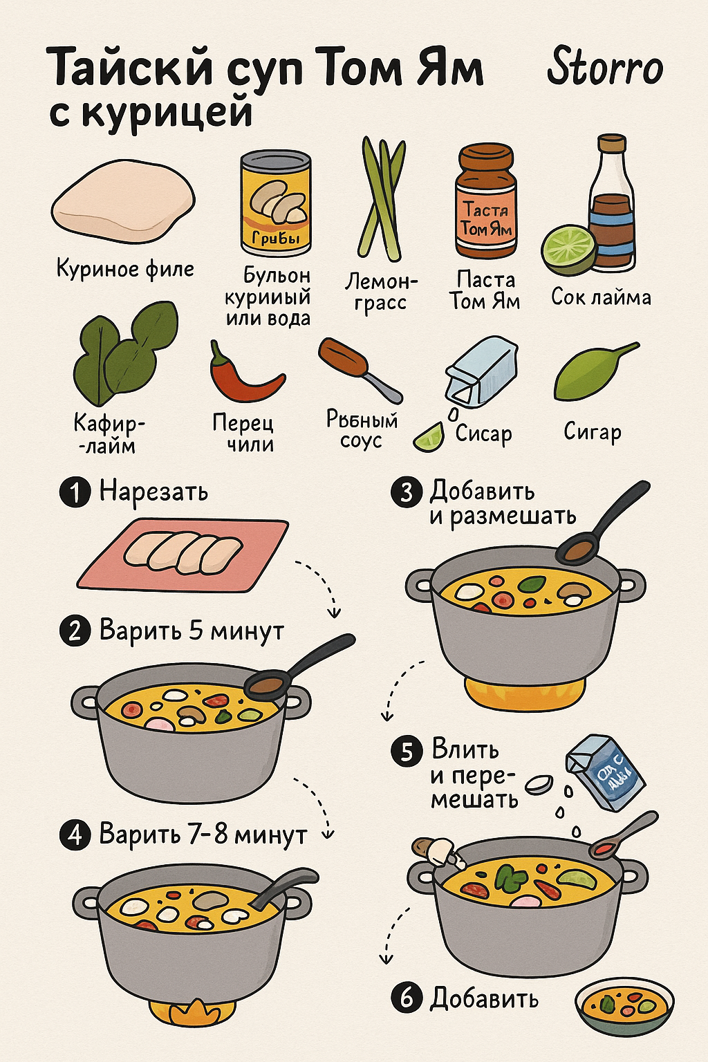 Рецепт блюда с использованием Грибы соломенные Цао Гу Amthai консервированные: тайский суп Том Ям с курицей 🍜