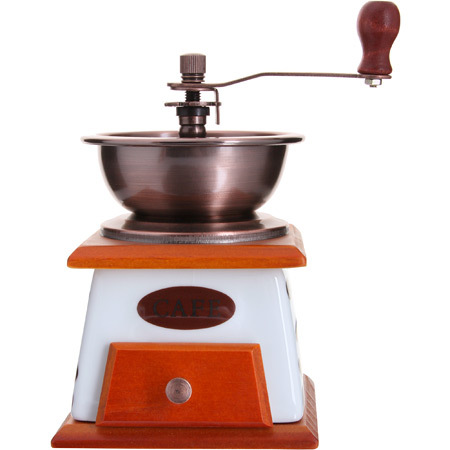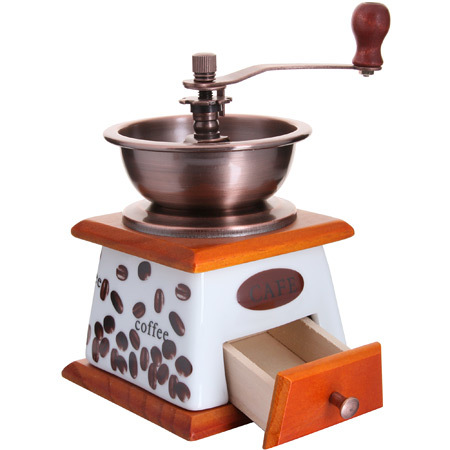 Ручная жерновая кофемолка с воронкой открытого типа. Металлическая воронка выполнена под бронзу, придавая кофемолке старинный, винтажный вид. Корпус кофемолки с выдвижным ящичком для молотого кофе выполнен из дерева и керамики. Механизм кофемолки изготовлен из нержавеющей стали и отличается прекрасными эксплуатационными свойствами. Ручная кофемолка станет идеальным приобретением для тех, кто ценит аромат и вкус свежемолотого кофе. Оригинальный дизайн данной ручной кофемолки, сочетающий в себе дерево, керамику и металл, позволит ей вписаться в любой интерьер и стать настоящим украшением кухни.