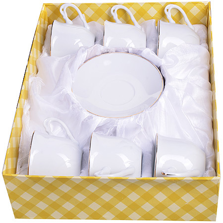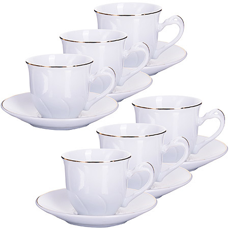 Кофейный набор на 6 персон LORAINE выполнен из высококачественной керамики - материала безопасного для здоровья и надолго сохраняющего тепло напитка.Несмотря на свою внешнюю хрупкость, каждый из предметов набора обладает высокой прочностью и надежностью. Элегантный классический дизайн с тонкой золотой каймой делает этот кофейный набор прекрасным украшением любого стола. Набор аккуратно упакован в подарочную упаковку, поэтому его можно преподнести в качестве оригинального и практичного подарка для своих родных и самых близких. В наборе: 6 кофейных чашек, 6 блюдец. Подходит для мытья в посудомоечной машине.