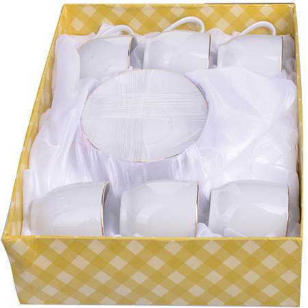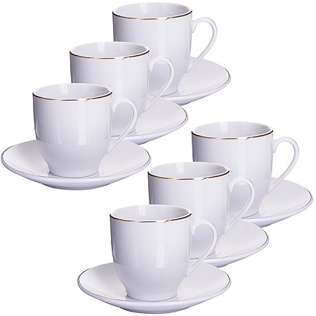 Кофейный набор на 6 персон LORAINE выполнен из высококачественной керамики - материала безопасного для здоровья и надолго сохраняющего тепло напитка.Несмотря на свою внешнюю хрупкость, каждый из предметов набора обладает высокой прочностью и надежностью. Элегантный классический дизайн с тонкой золотой каймой делает этот кофейный набор прекрасным украшением любого стола. Набор аккуратно упакован в подарочную упаковку, поэтому его можно преподнести в качестве оригинального и практичного подарка для своих родных и самых близких. В наборе: 6 кофейных чашек, 6 блюдец. Подходит для мытья в посудомоечной машине.