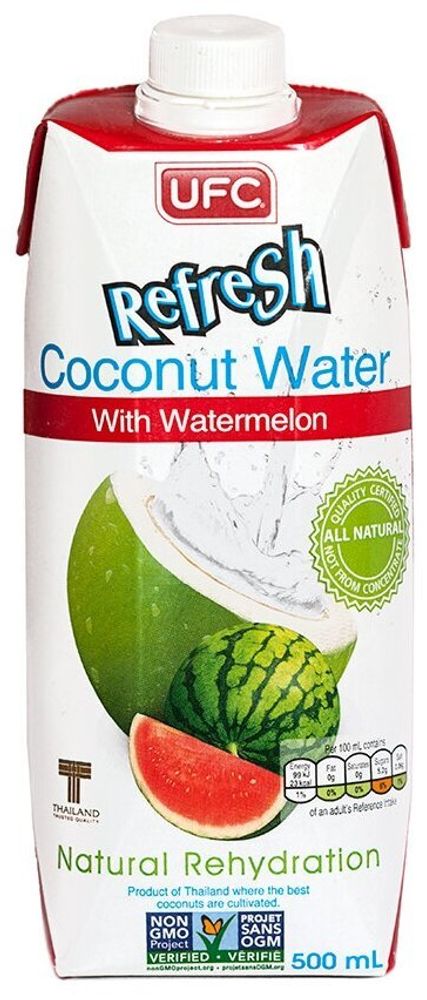 Состав: Кокосовая вода - 94,9%, сок тайского арбуза - 5%, натуральный фруктовый ароматизатор - 0,09%, витамин С - 0,01%