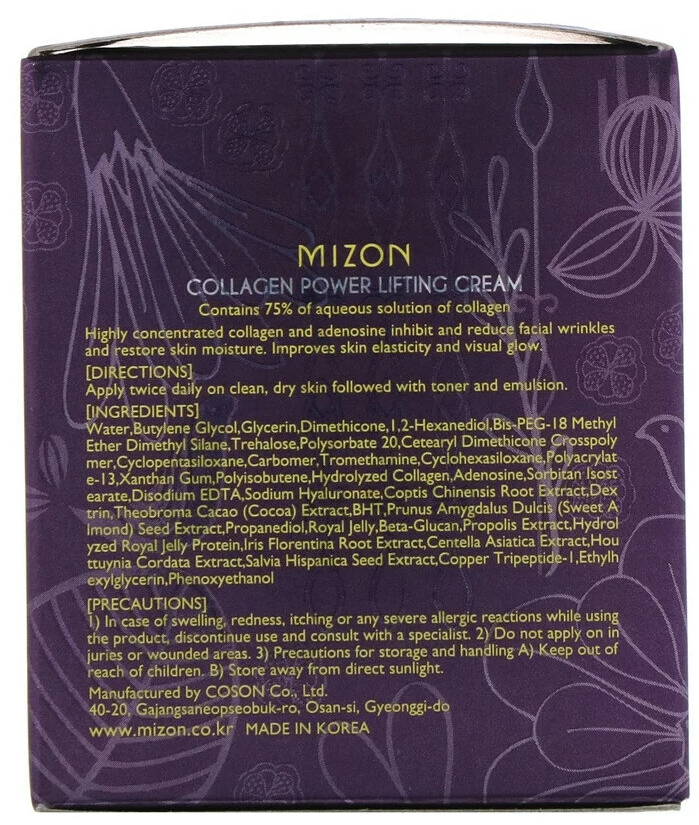 Гелеобразный коллагеновый лифтинг-крем для лица Mizon | Мизон – идеальное средство ухода за слегка увядающей, склонной к дряблости кожей. Он максимально питает и увлажняет каждую клеточку эпителия, помогая при этом восстановить водный баланс и сохранить природную упругость и эластичность. Лифтинг-крем на основе морского коллагена позволяет мгновенно напитать кожу, а также помочь ей сохранить молодость, упругость и естественное сияние. Способ применения: наносить на уже очищенную кожу лица после использования тонера и эмульсии дважды в день, нанося подушечками пальцев до полного впитывания. Состав: вода, коллаген, циклопентасилоксан, диметикон/винил диметикон кроссполимер, диметикон, глицерин, бутиленгликоль, бис-пег-18-метиловый эфир диметилсилана, трегалоза, гиалуронат натрия, полисорбат 20, карбомер, триэтаноламин, полиакрилат-13, полиизобутилен, ксантановая камедь, бета-глюканы, трипептид меди, аденозин, экстракт корня коптиса японского, экстракт какао, гидролизованный экстензин