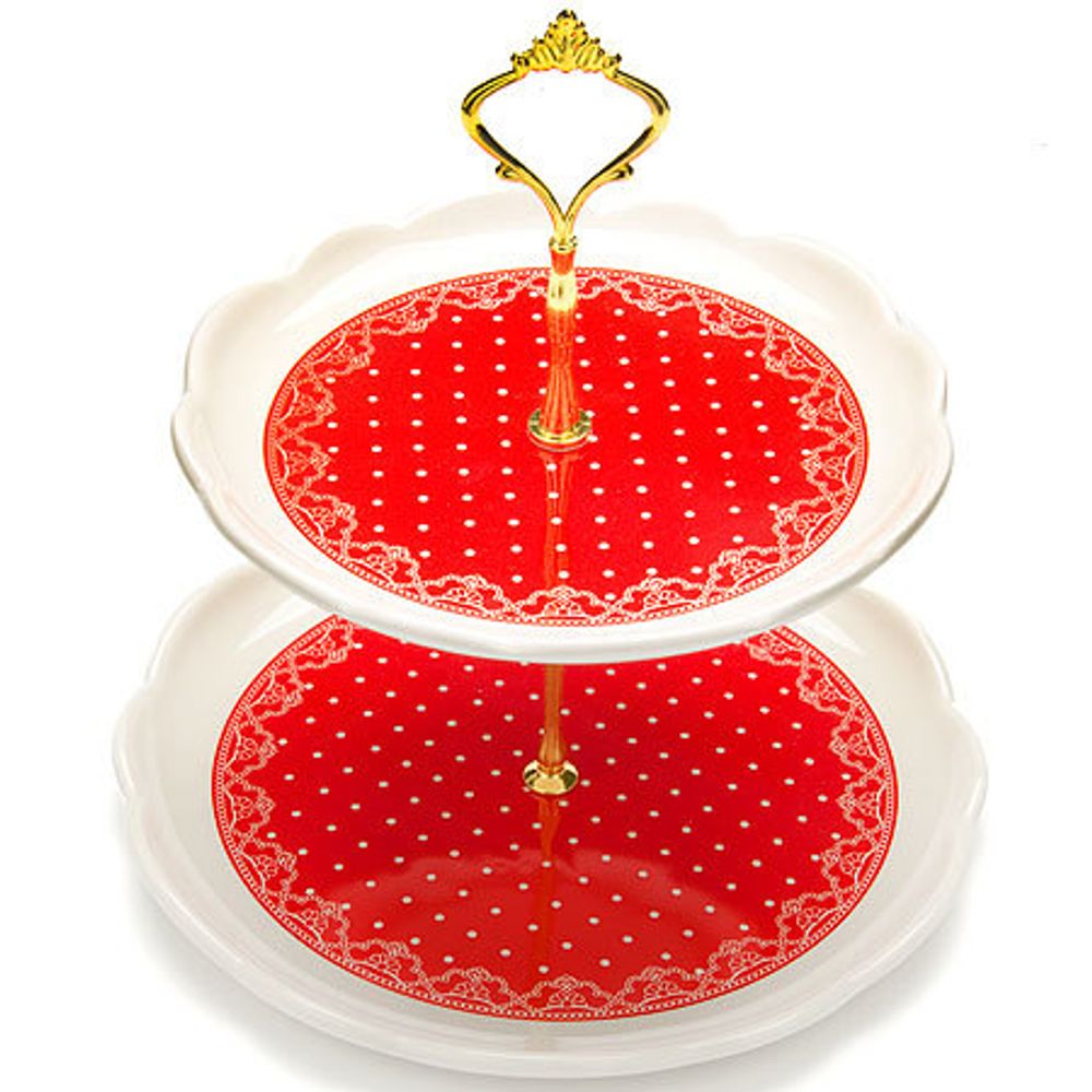 Красочная конфетница LORAINE, выполненная из высококачественной керамики, сочетает в себе классический дизайн с максимальной функциональностью. Конфетница состоит из 2-х ярусов разного размера и предназначена для красивой сервировки конфет, фруктов и десертов. Круглые ярусы конфетницы имеют волнистые края и оформлены в красно-белых тонах с белым узором. Стойка-держатель конфетницы выполнена из металла с золотым напылением. Высота конфетницы в собранном виде составляет около 28 см. Элегантная конфетница LORAINE украсит сервировку Вашего стола и подчеркнет прекрасный вкус хозяйки, а также станет отличным подарком. Изделие упаковано в индивидуальную коробку. Подходит для использования в холодильнике, посудомоечной машине.
