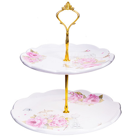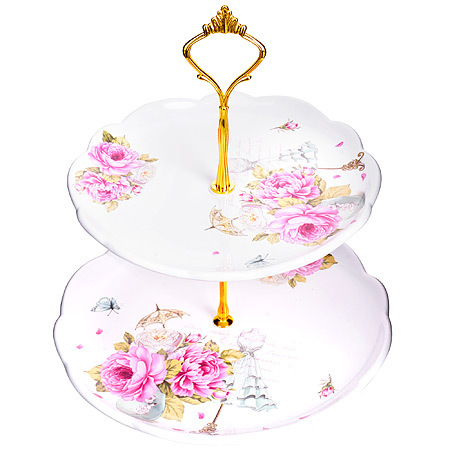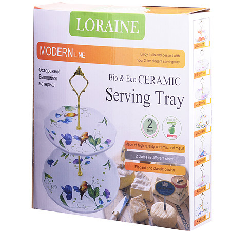 Красочная конфетница LORAINE, выполненная из высококачественной керамики, сочетает в себе классический дизайн с максимальной функциональностью. Конфетница состоит из 2-х ярусов разного размера и предназначена для красивой сервировки конфет, фруктов и десертов. Круглые ярусы конфетницы имеют волнистые края. Стойка-держатель конфетницы выполнена из металла с золотым напылением. Высота конфетницы в собранном виде составляет около 28 см. Элегантная конфетница LORAINE украсит сервировку Вашего стола и подчеркнет прекрасный вкус хозяйки, а также станет отличным подарком. Изделие упаковано в индивидуальную коробку. Подходит для использования в холодильнике, посудомоечной машине.