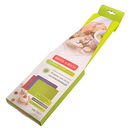 Коврик для выпечки MAYER&BOCH выполнен из 100% силикона. Силиконовая подложка позволяет полностью отказаться от использования пергамента и специальной бумаги для выпечки. На коврике удобно раскатывать тесто, даже не посыпая его мукой. Всегда кладите силиконовый коврик для выпечки только на чистый противень. Если на нём остались какие-либо следы сахара или жира, их необходимо отчистить – при нагревании такие вещества легко прилипают к силиконовой поверхности. Силиконовый коврик – лучшее антискользящее покрытие. Благодаря прекрасным термоустойчивым характеристикам коврика, его можно использовать в качестве практичной подставки под горячее. Силиконовые коврики идеально подходят для использования в микроволновых, газовых и электрических печах при температурах до +230°С. В случае заморозки до -40°С.