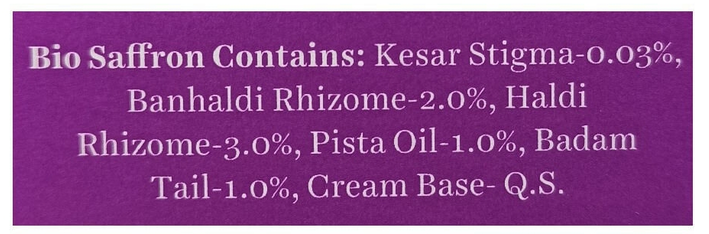 Крем с шафраном - источник природных витаминов, минералов и питательных веществ, его активные растительные компоненты предохраняют кожу от старения, появления пятен и дефектов, при регулярном использовании заметно сокращает морщины. Крем обогащен маслами миндаля и фисташки, а также содержит натуральные экстракты куркумы и дикой куркумы, которые обладают противовоспалительными и защитными свойствами. Шафран – одна из самых дорогих специй во всем мире, натуральный источник витаминов, минералов и питательных веществ для кожи, обладает омолаживающими свойствами.