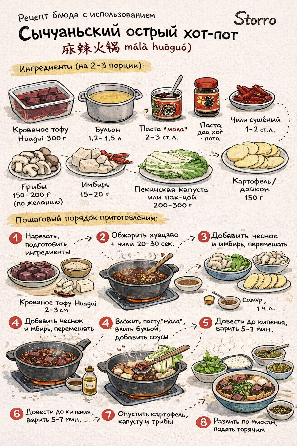 Сычуаньский острый хот-пот с утиным кровяным тофу — культовое блюдо китайской кухни: кипящий ароматный бульон, в который гости по очереди окунают тонкие ломтики мяса, грибы, овощи и разные “топпинги”. Утиное кровяное тофу здесь особенно популярно: оно нежное, чуть упругое и отлично впитывает пряный бульон 🌶️🍲