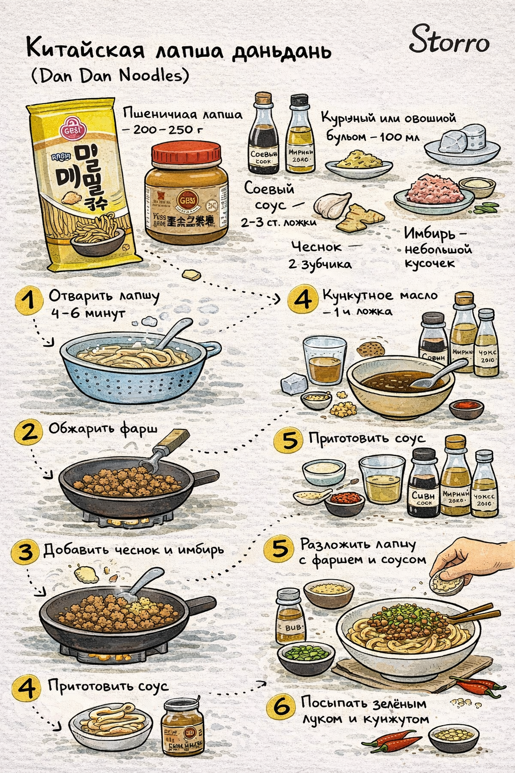 Китайская лапша даньдань (Dan Dan Noodles) — известное блюдо сычуаньской кухни, которое славится насыщенным ореховым вкусом и ароматным пряным соусом. Традиционно лапшу подают с густым соусом на основе кунжутной или арахисовой пасты, соевого соуса, чеснока и специй. Блюдо получается очень ароматным, слегка острым и сытным. Благодаря кунжутно-арахисовой пасте соус приобретает нежную кремовую текстуру и глубокий ореховый вкус.