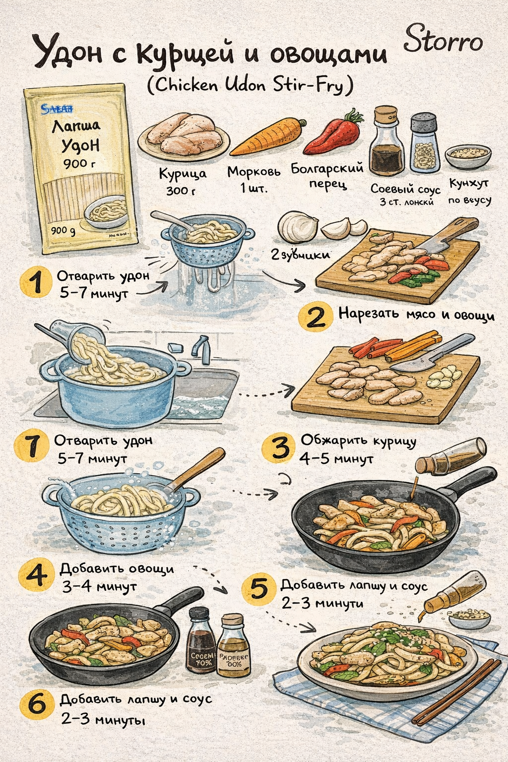 Удон с курицей и овощами (Chicken Udon Stir-Fry) — популярное блюдо японской кухни, которое часто готовят дома и подают в кафе по всей Азии. Толстая пшеничная лапша удон отлично впитывает соус и сохраняет приятную упругую текстуру. В сочетании с сочной курицей, свежими овощами и ароматным соевым соусом получается сытное и очень ароматное блюдо, которое готовится довольно быстро.