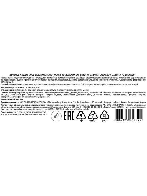 LION Зубная паста для ежедневного ухода Ледяная мята Systema 120 мл 2 уп