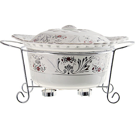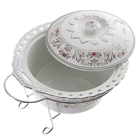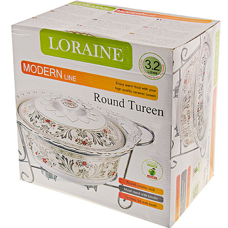 Мармит LORAINE выполнен из керамики белого цвета, украшенной рисунком. Керамическая чаша с удобными ручками располагается на стальной подставке с двумя подсвечниками для чайных свечей (входят в комплект). Свечи, устанавливающиеся на подставке, нагревают чашу снизу, таким образом поддерживая нужную температуру приготовленного блюда. Керамическая крышка с удобной ручкой плотно прикрывает чашу сверху, в свою очередь также не давая остыть блюду. Благодаря своему элегантному дизайну, мармит с приготовленным блюдом можно сразу подавать на стол, не перекладывая еду на сервировочные тарелки. Изящный, с современным дизайном, мармит украсит любой праздничный стол, а блюда в нем будут всегда теплыми и ароматными. Керамическая чаша (без подставки) подходит для использования в духовом шкафу и микроволновой печи. Подходит для мытья в посудомоечной машине. Подходит для хранения в холодильнике.