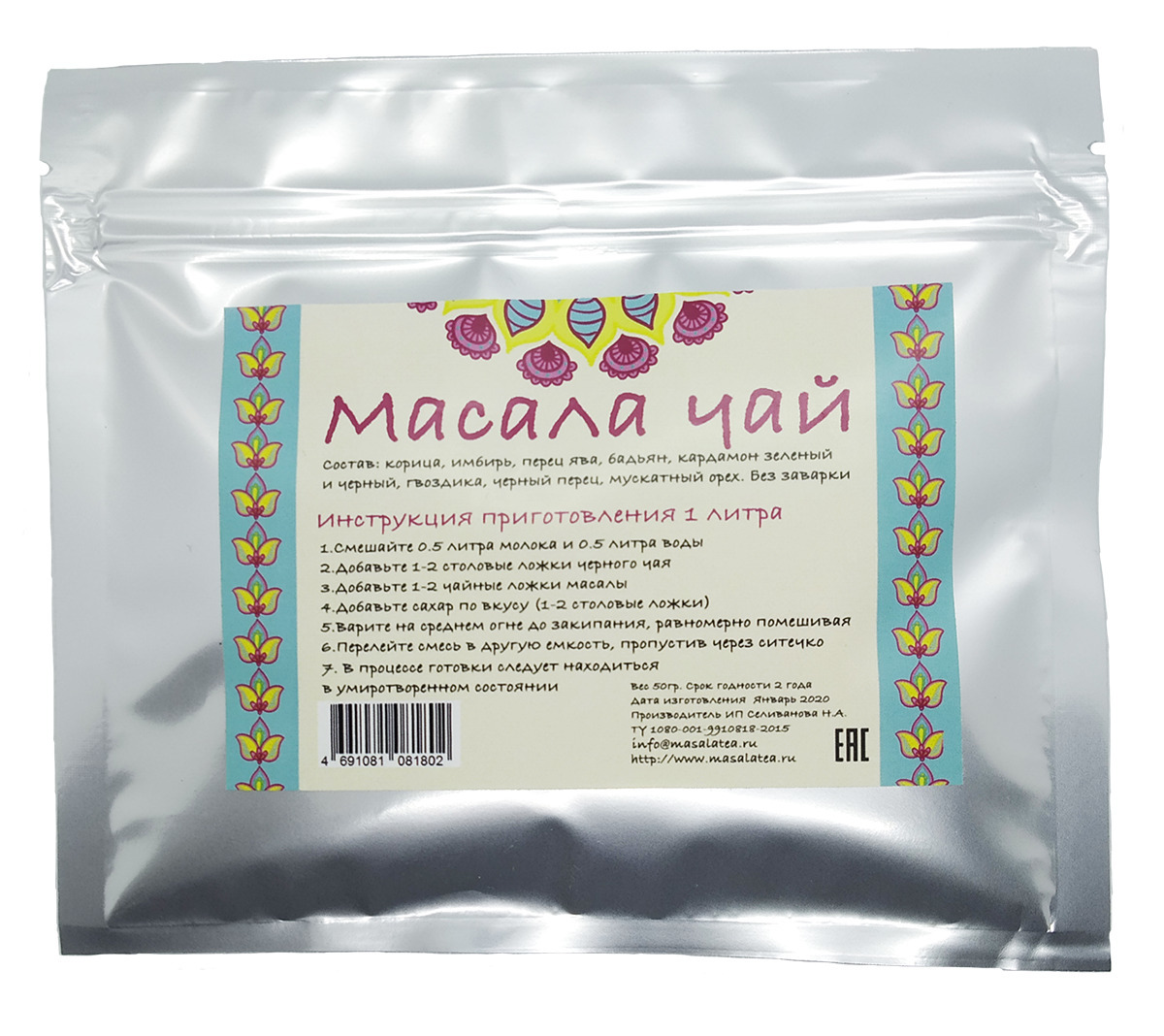 Способ приготовления: Масала чай готовится в несколько этапов. Сначала смешайте воду и молоко в равных пропорциях - возьмите объем по ½ литра каждого. В смесь добавьте по 2 и более столовых ложек крупнолистового черного чая и смеси специй из упаковки. Для сладости используйте тростниковый или обычный сахар или карамельный сироп. Варите раствор на маленьком огне, постоянно перемешивайте и доведите до кипения. После закипания дайте чаю настояться 15-30 минут. После этого аккуратно процедите его и подавайте к столу самостоятельно или вместе с домашней выпечкой (печенье, кексы, торты и т.д.).