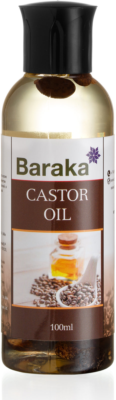Масло касторовое Baraka – комплексное натуральное средство для ухода за волосами, кожей головы, ресницами и бровями. Сырье для касторки добывают из однолетнего растения – клещевины обыкновенной. Входящая в его состав рициновая кислота (более 80%) служит основой для формирования межклеточных мембран, восстановления кожного и слизистого покровов, их увлажнения и питания.