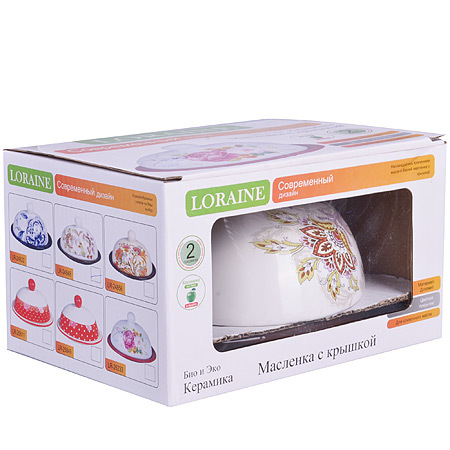 Масленка LORAINE овальной формы, выполненная из качественной доломитовой керамики и декорированная нежным рисунком, станет украшением интерьера вашей кухни. Масленка надежно закрывается керамической крышкой и прекрасно подойдет для хранения и сервировки масла, сыра, творога. Масленка рассчитана примерно на 200 г. масла. Пригодна для использования в холодильнике, морозильнике, микроволновой печи. Подходит для мытья в посудомоечной машине.