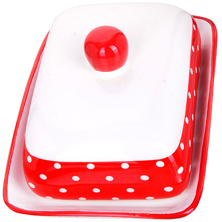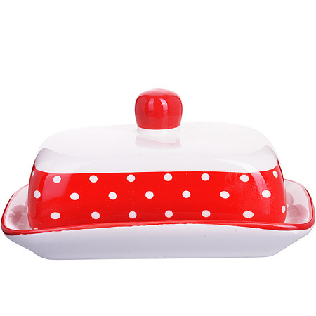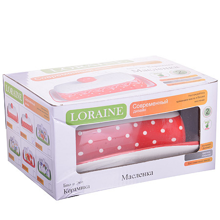 Масленка LORAINE, выполненная из качественной доломитовой БИО и ЭКО керамики красного-белого цвета и украшенная белым горохом, станет украшением интерьера вашей кухни. Керамика - это экологически чистый материал, который не наносит вред Вашему здоровью. Кроме того, этот материал защищает продукты и пищу от образования вредных бактерий. Масленка надежно закрывается керамической крышкой и прекрасно подойдет для хранения и сервировки масла, сыра, творога. Масленка рассчитана примерно на 200 г. масла. Пригодна для использования в холодильнике, морозильнике, микроволновой печи. Подходит для мытья в посудомоечной машине.