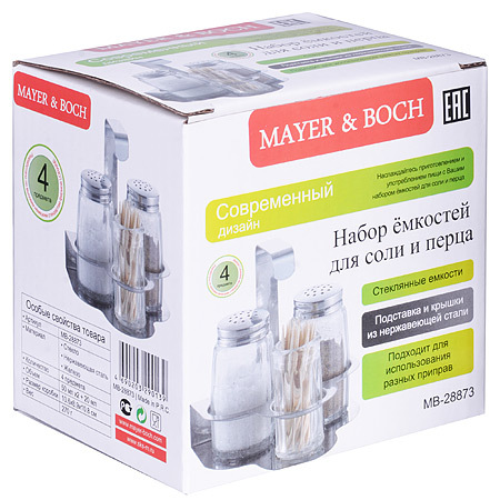 Набор для специй MAYER&BOCH на подставке — это небольшой набор с емкостями для хранения разных по типу специй: тертый кориандр, черный перец, соль и прочее. Поэтому обязательно станет полезным дополнением на столе. Корпус изделия оригинально смоделирован, отличается превосходным дизайном, что позволяет использовать его для обслуживания посетителей в ресторанах.