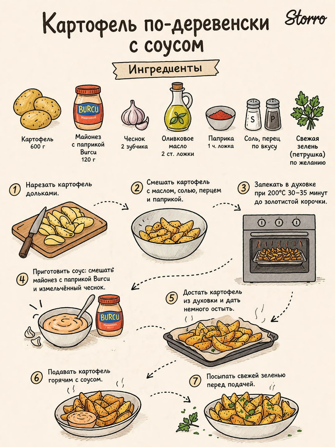 Это блюдо вдохновлено испанской кухней — картофель по-деревенски с соусом в стиле айоли с паприкой. Хрустящий снаружи и мягкий внутри картофель в сочетании с ароматным соусом создаёт насыщенный вкус с лёгкой пикантной ноткой. Такое блюдо отлично подойдёт как закуска или гарнир к мясу и птице 🥔✨