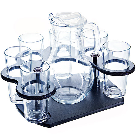 Минибар состоит из 6 рюмок, графина и деревянной подставке. Графин и рюмки, изготовленные из высококачественного стекла. Такой набор прекрасно дополнит праздничный стол и станет желанным подарком в любом доме.