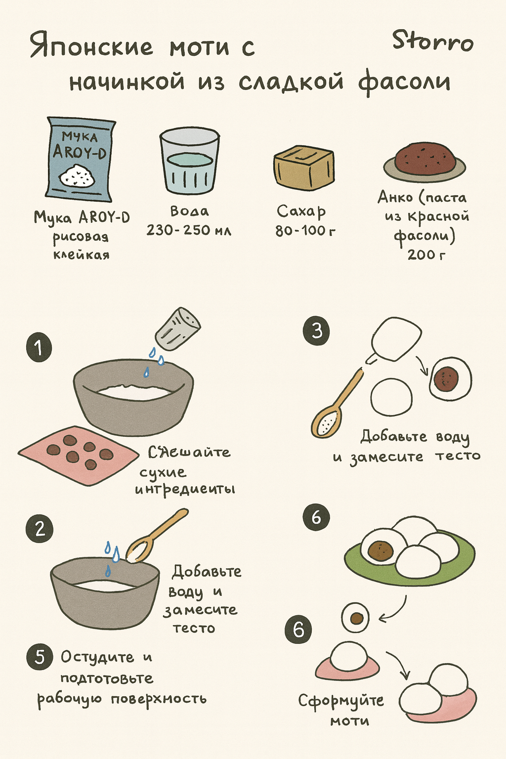 Приготовим японские моти с начинкой из сладкой фасоли – мягкие тянущиеся пирожные, которые подают к чаю на праздники и в будни 🍵. Благодаря клейкой рисовой муке Aroy-D тесто получается эластичным и нежным, а простая сладкая начинка делает десерт любимым во многих семьях. Такие моти удобно брать с собой, дарить друзьям или подавать на домашнем чаепитии 😋