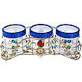 Набор из 3-х банок для сыпучих продуктов выполнен из высококачественного стекла и декорирован нежным рисунком. Банки располагаются на изящной ажурной металлической подставке. Набор предназначен для хранения различных сыпучих продуктов: сахара, кофе, чая, специй и т.п. Цветные пластиковые крышки с прозрачным верхом, плотно закрываются и препятствуют проникновению влаги и посторонних запахов внутрь. Необычный и оригинально оформленный набор банок послужит прекрасным подарком и украсит любую кухню. Изделия не впитывают запахи и легко моются.