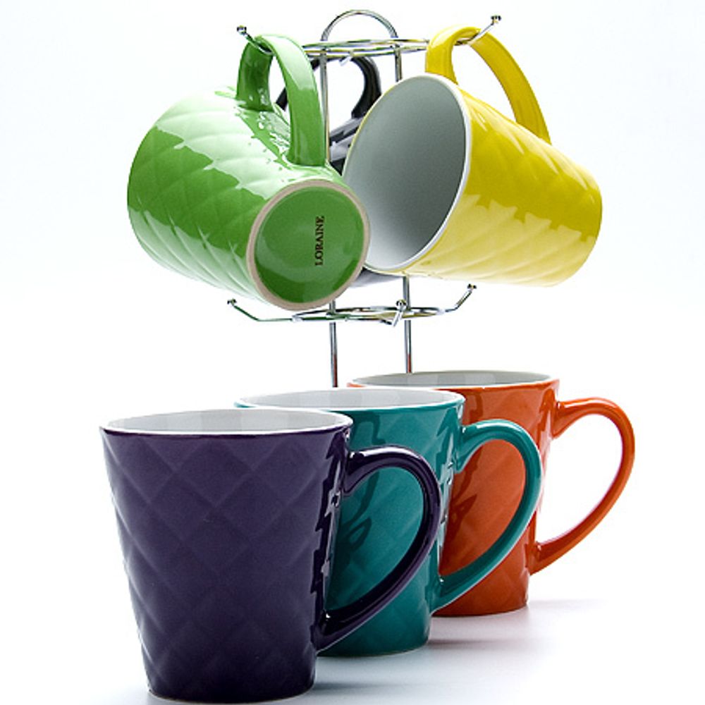 Чайный набор состоит из 6 чашек и 1 металлической подставки. Предметы набора изготовлены из разноцветной керамики. Цвета: желтый, оранжевый, зеленый, голубой, фиолетовый, черный. За счет рельефной текстуры стенок, кружки приятно держать в руках. Элегантный дизайн набора придется по вкусу и ценителям классики, и тем, кто предпочитает утонченность и изысканность. Он настроит на позитивный лад и подарит хорошее настроение с самого утра. Кружки можно мыть в посудомоечной машине и использовать в микроволновой печи.