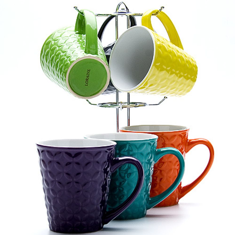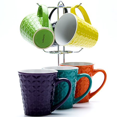 Чайный набор состоит из 6 чашек и 1 металлической подставки. Предметы набора изготовлены из разноцветной керамики. Цвета: желтый, оранжевый, зеленый, голубой, фиолетовый, черный. За счет рельефной текстуры стенок, кружки приятно держать в руках. Элегантный дизайн набора придется по вкусу и ценителям классики, и тем, кто предпочитает утонченность и изысканность. Он настроит на позитивный лад и подарит хорошее настроение с самого утра. Кружки можно мыть в посудомоечной машине и использовать в микроволновой печи.