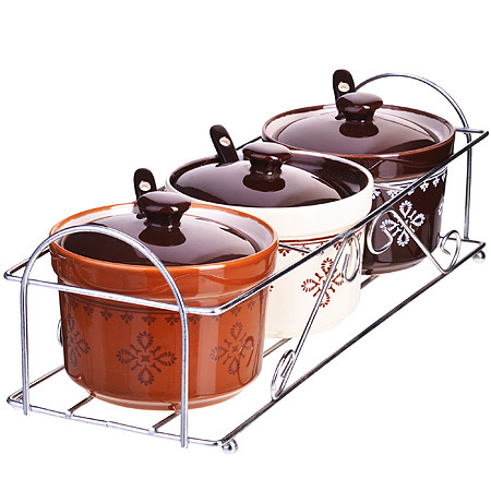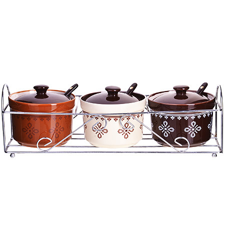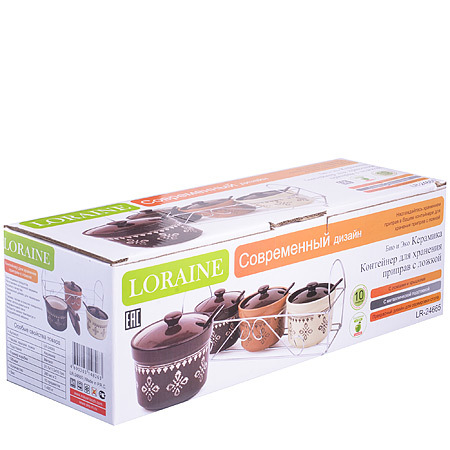 Набор для специй LORAINE выполнен из высококачественной керамики и декорирован оригинальным узором. Набор для специй состоит из 3-х керамических банок с крышками, 3-х ложек и металлической подставки. Набор контейнеров на подставке - это удобный и компактный вариант для хранения сахара, соли, варенья, меда и различных специй, кроме того, набор прекрасно украсит вашу кухню. Изделия подходят для мытья в посудомоечной машине.