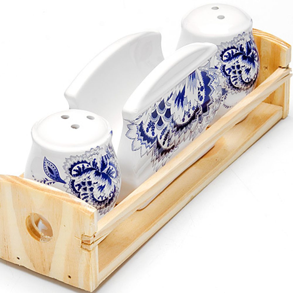 Набор для специй состоит из солонки, перечницы, салфетницы и деревянной подставки. Предметы набора выполнены из высококачественной доломитовой керамики белого цвета и красиво оформлены синим узором. Отверстия, в которые засыпаются специи, закрыты силиконовыми пробками. Благодаря своим небольшим размерам набор не займет много места на вашей кухне. Дизайн, эстетичность и функциональность набора позволят ему стать достойным дополнением к кухонному инвентарю.