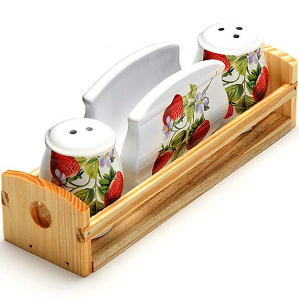 Набор для специй LORAINE состоит из солонки, перечницы, салфетницы и деревянной подставки. Предметы набора выполнены из прочной доломитовой БИО и ЭКО керамики. Отверстия, в которые засыпаются специи, закрыты силиконовыми пробками. Благодаря своим небольшим размерам набор не займет много места на Вашей кухне. Дизайн, эстетичность и функциональность набора позволят ему стать достойным дополнением к кухонному инвентарю и украсить сервировку Вашего стола.