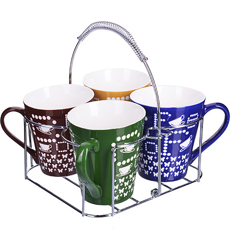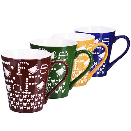 Набор из 4-х разноцветных кружек изготовлен из высококачественной керамики, украшен белым узором и стилизованной надписью "Coffee". Изящный дизайн придется по вкусу и ценителям классики, и тем, кто предпочитает современность. Он настроит на позитивный лад и подарит хорошее настроение с самого утра. Изделия можно компактно хранить на подставке, входящей в набор. Набор кружек - идеальный и необходимый подарок для вашего дома и для ваших друзей в праздники, юбилеи и торжества. Подходит для мытья посудомоечной машине.