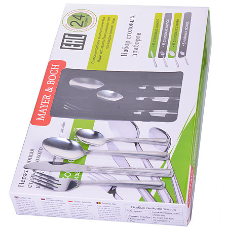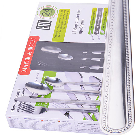 Набор столовых приборов MAYER&BOCH на 6 персон включает в себя 24 предмета: 6 столовых ложек, 6 вилок, 6 ножей, 6 чайных ложек. Столовые приборы изготавливаются из высококачественной нержавеющей стали, все изделия проходят тщательный технологический контроль. Приборы из нержавеющей стали отличаются высокими антикоррозионными свойствами, значительной устойчивостью к воздействию кислот и щелочей. Такая сталь не изменяет вкус и цвет пищи, не выделяет вредных веществ. Столовые приборы выполнены в минималистическом дизайне, ручки приборов декорированы тонком рельефным узором. Стильный, классический дизайн и отличное качество столовых приборов MAYER&BOCH делают набор желанной покупкой для любого, даже самого пристрастного, клиента. Набор столовых приборов MAYER&BOCH, безусловно, займет достойное место на любой кухне. Столовый набор прекрасно подходит для сервировки стола, как в домашнем быту, так и в профессиональных заведениях: кафе, ресторанах. Набор упакован в коробку с прозрачным окном сверху. Подходит для мытья в посудомоечной машине.