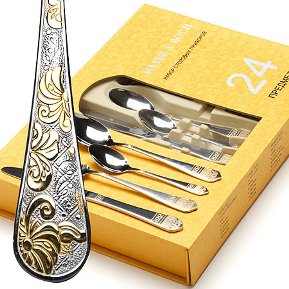 Набор столовых приборов MAYER&BOCH на 6 персон выполнен из высококачественной нержавеющей стали, ручки приборов имеют глянцевую полировку и декорированы изящным золотым орнаментом. Набор из 24-х предметов включает в себя: 6 столовых ложек, 6 вилок, 6 ножей и 6 чайных ложек. Благодаря качественной полировке, изделия сохраняют прекрасный внешний вид на долгое время. Набор обладает не только оригинальным дизайном, но и практичностью, так как изделия из качественной нержавеющей стали имеют высокую прочность, устойчивость к коррозии, кроме того, нержавеющая сталь экологична, она не меняет вкусовые свойства еды, потому как не вступает в реакцию с ее компонентами. Упакованный в красочную подарочную коробку такой набор безусловно станет прекрасным подарком для любой хозяйки и украсит ваш праздничный стол. Подходит для мытья в посудомоечной машине.