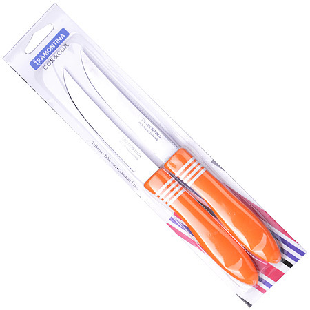 Нож Tramontina изготовлен из высококачественной нержавеющей стали, обеспечивающей высокие режущие свойства кромки клинка. Нож имеет острое лезвие с ровной поверхностью и выверенным углом заточки, а также имеет специальную закалку металла для повышения прочности. Поверхность клинка легко моется, не впитывает и не «передает» запахи пищи при нарезке продуктов. Нож идеально подойдет для резки как мяса и рыбы, так и фруктов и овощей. Тщательно разработанный дизайн рукоятки и ее качество, позволяют ножу удобно располагаться в руке. Нож изготовлен из экологически чистых материалов, легок и прост в эксплуатации и уходе. Подходит для мытья в посудомоечной машине. (Ножи упакованы по 2 шт. на блистере).