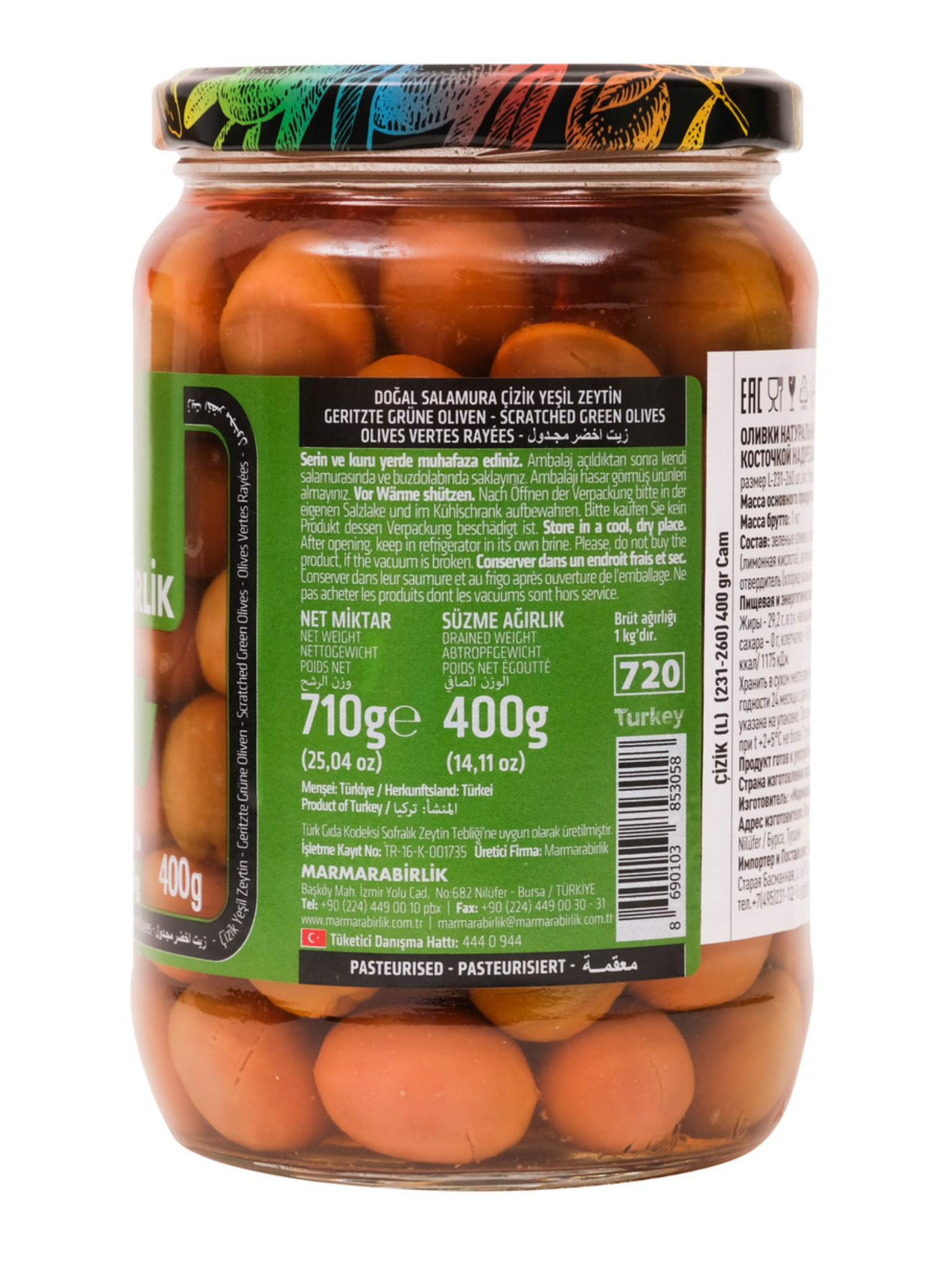 НАТУРАЛЬНЫЕ ЗЕЛЕНЫЕ ОЛИВКИ ЧИЗИК - это уникальный и специфический продукт. Ягоды подвергаются естественной, а не химической обработке. Плоды помещаются в соляной резервуар, где со временем теряют свою горечь. Но она намеренно не выводится из них до конца, сохраняя олеуропеин - самое полезное вещество в плодах. Поэтому оливки Marmarabirlik не только имеют фирменные лёгкие горечь и солёность, но и полезны для здоровья. Попробуйте и Вы, чтобы убедиться, что вкус и польза сочетаются в одном продукте!