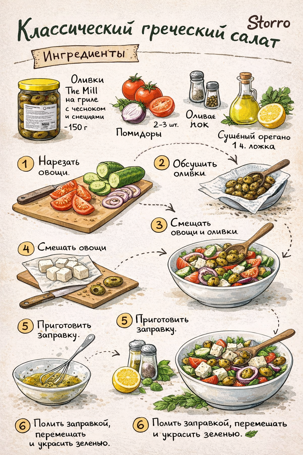 Это блюдо вдохновлено классическим греческим салатом, но с более насыщенным вкусом благодаря ароматным оливкам на гриле. Сочетание свежих овощей, сливочного сыра и пикантных оливок делает его идеальным как для лёгкого ужина, так и для подачи на праздничный стол 🫒✨