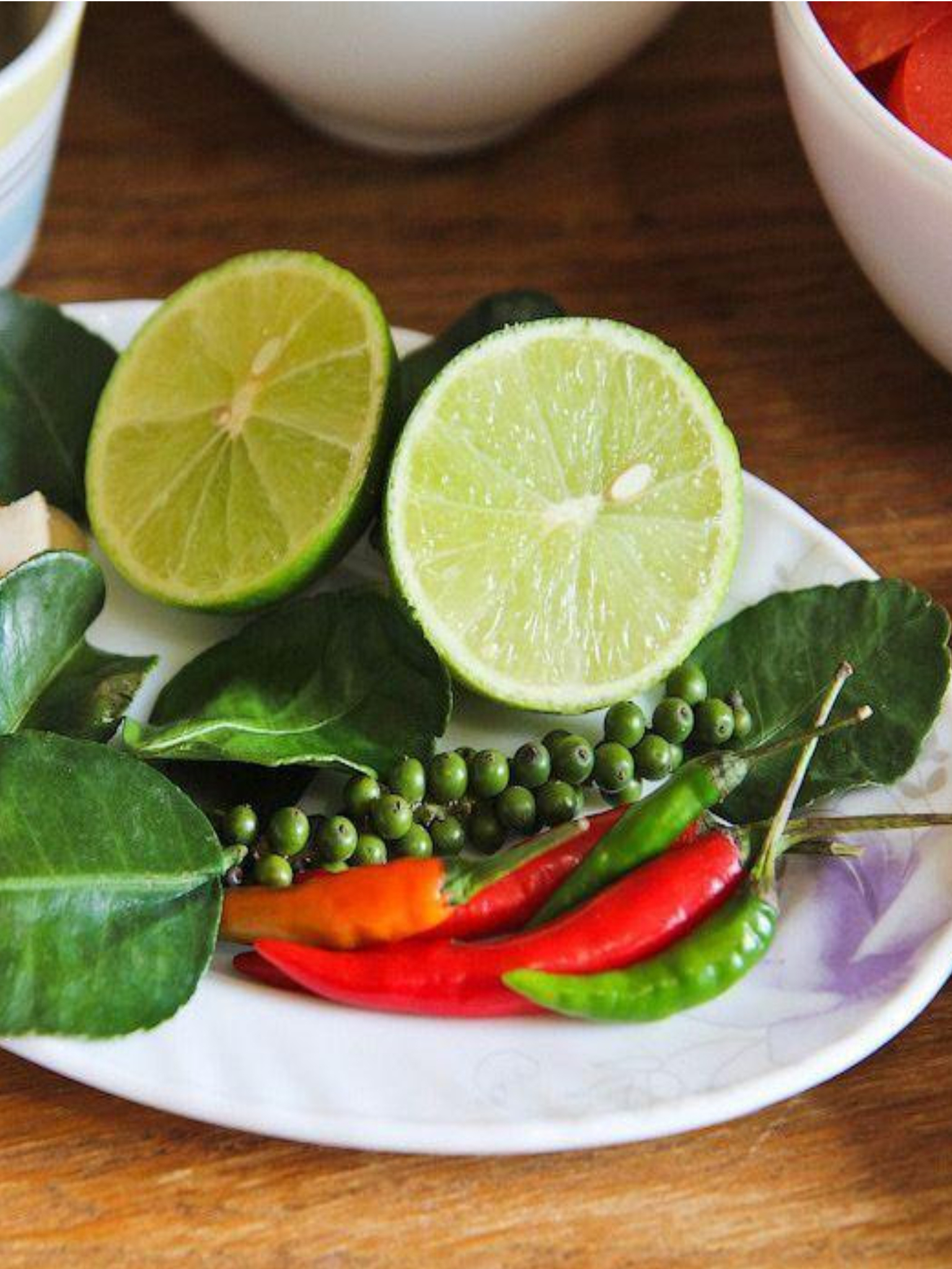 Добавьте куриный бульон, лемонграсс, листья каффир-лайма, рыбный соус и сахар. Доведите до кипения.