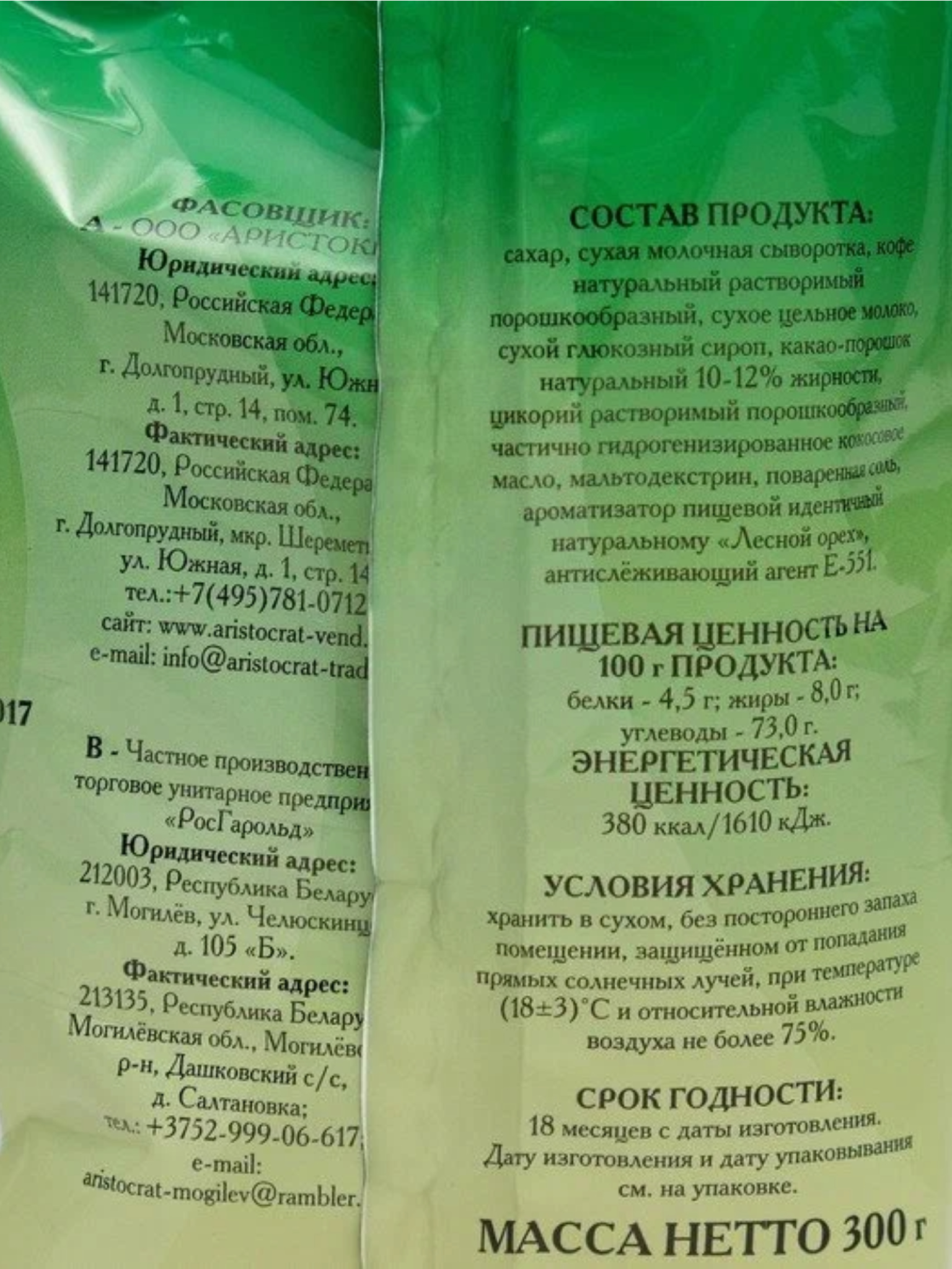 Состав: сахар, масла растительные, глюкозный сироп, сыворотка молочная, сухое молоко, кофе растворимый,какао-порошок, цикорий, крахмал картофельный, соль, добавки