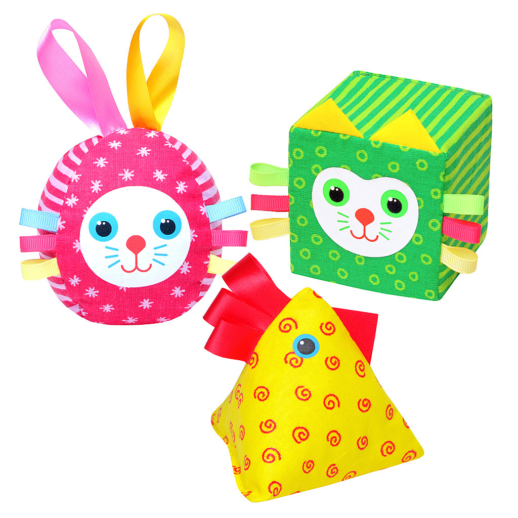Яркий набор "Весёлая дидактика" состоит из трёх геометрических форм: куба, шара и пирамиды + дидактические карточки.
