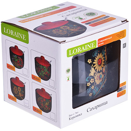 Сахарница LORAINE изготовлена из прочной керамики высокого качества c цветным рисунком. Сахарница закрывается удобной крышкой. В комплекте идет небольшая керамическая ложечка. Такая сахарница понравится любителям яркого оригинального дизайна и станет неотъемлемым атрибутом чаепития. Предметы набора можно мыть в посудомоечной машине. Не применять абразивные моющие средства.